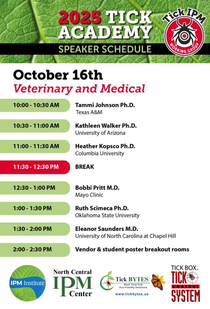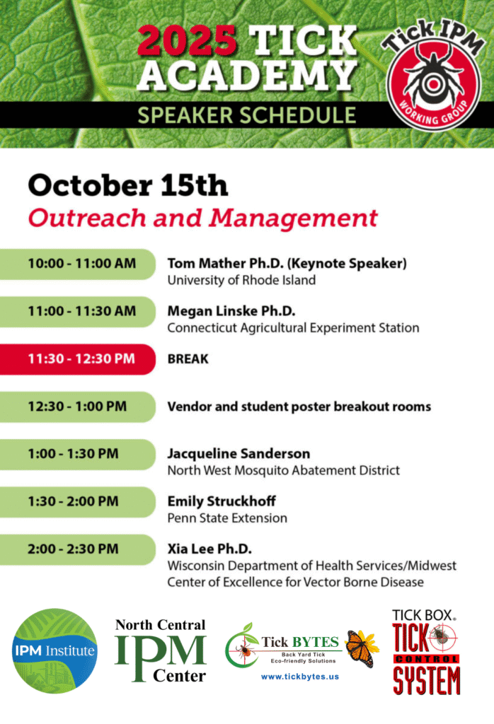 In 2025, legislation in Illinois expanded the authority of mosquito abatement districts to include tick surveillance and pathogen testing. In response, the Northwest Mosquito Abatement District (NWMAD) launched a tick surveillance program in fall 2024 and integrated tick education into its community outreach efforts. This program includes three major components: (1) systematic collection and identification of tick species across the district, (2) pathogen testing of specimens, and (3) public education on tick bite prevention and tick-borne disease risk.